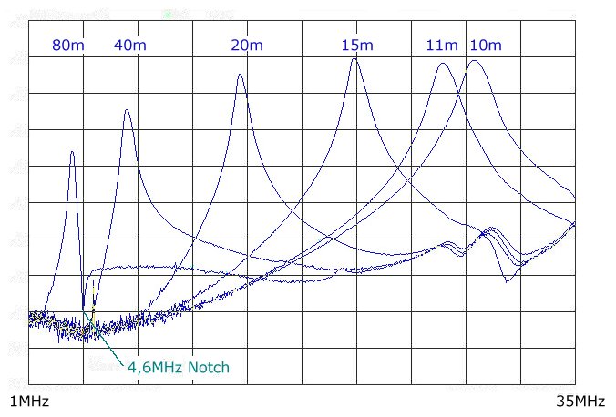 Die folgende Abbildung zeigt das (qualitative) gemeinsame Übertragungsverhalten der Vor- und Zwischenkreise jeweils in der (geometrischen) Bandmitte der empfangbaren Amateurbänder. Es ist zu erkennen, dass die HF-Verstärkung vom 80m-Band bis zum 30m-Band zunimmt. Verantwortlich hierfür ist ein einstellbarer Spannungsteiler, der an die Bandumschaltung gekoppelt ist und so das Schirmgitter der Vorröhre mit verschiedenen Spannungen versorgt, was zur Folge hat, dass sich die Steilheit (-> Verstärkung) der Röhre ändert. Bei moderneren Breitbandempfängern hat man einen ähnlichen Effekt durch einen in die Zuleitung zum HF-Verstärker eingeschleiften (überbrückbaren) Hochpass erzielt. Außerdem ist der deutliche Einfluß des 4,6MHz Sperrkreises, der sich in der Antennenzuleitung befindet, zu sehen. Er versteilert die obere Filterflanke im 80m-Band und die untere Filterflanke im 40m-Band.
