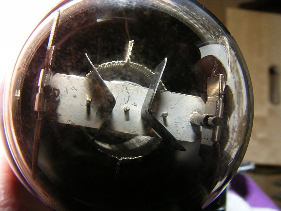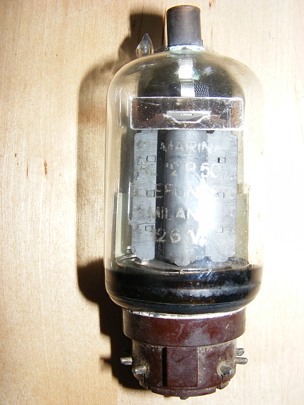 Ich habe im Radiomuseum nachgesehen, da werden 4V/1,75 A für die Heizung angegeben. Allerdings passt der sichtbare Teil, der Innereien, besonders des Röhrenkopfes. zu einer AL4. Ich habe bei 4V allerdings nur 1,5 A gemessen, eine AL4 hat aber 1,75 A Stromaufnahme.