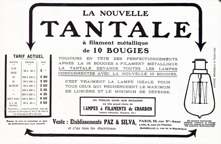 Tantal-Lampen hat neben Paz&Silva auch Siemens&Halske schon 1903 gebaut. Das Wolfram kam erst ein Jahrzehnt später ins Rennen. Die Fertigung der Tantal-Lampen war teuer und nur etwas für das gehobene Bürgertum. Während Kohlefaden-Lampen nur einige hundert Stunden bis maximal 1000 Stunden brannten, konnte Tantal 3000 Stunden brennen.
