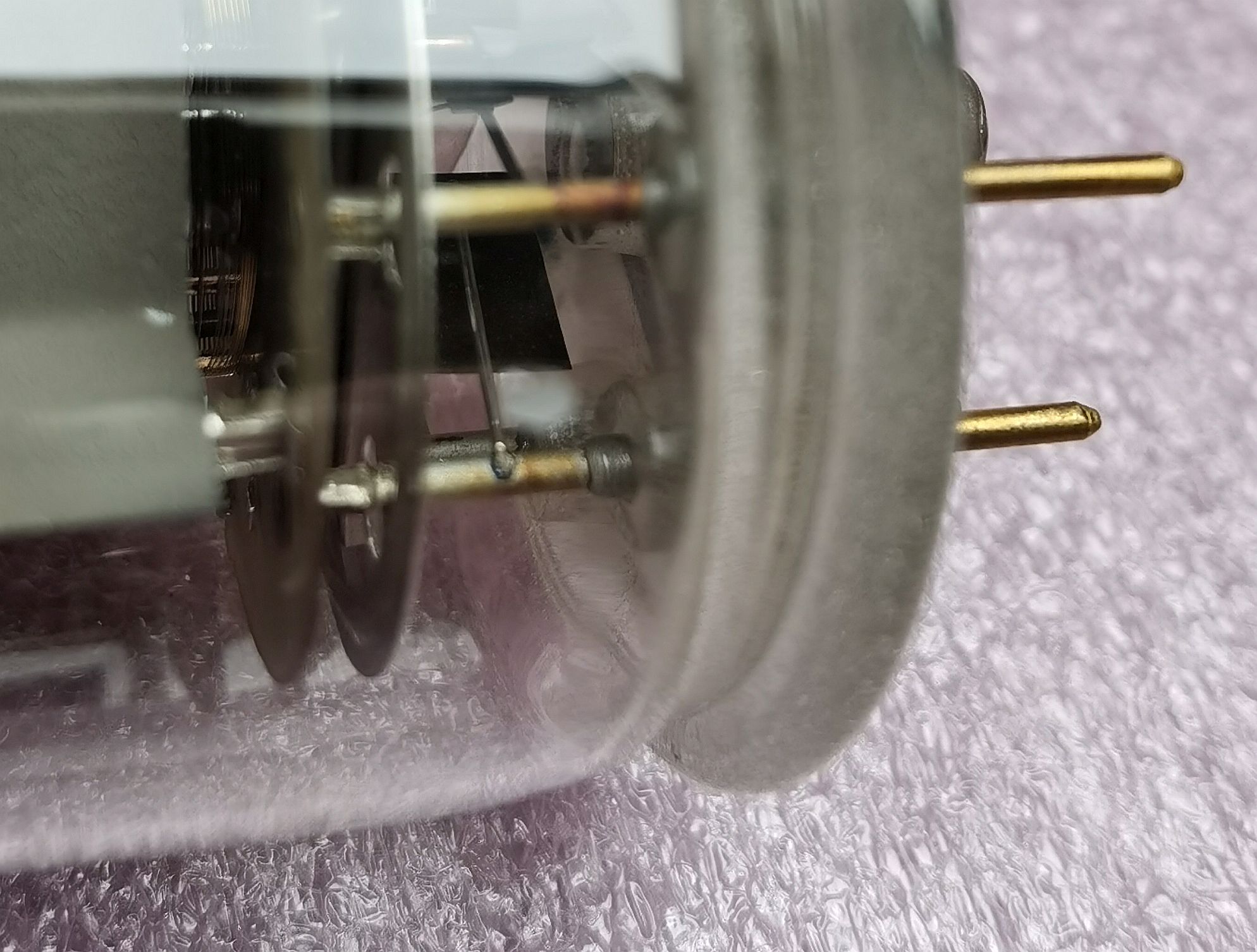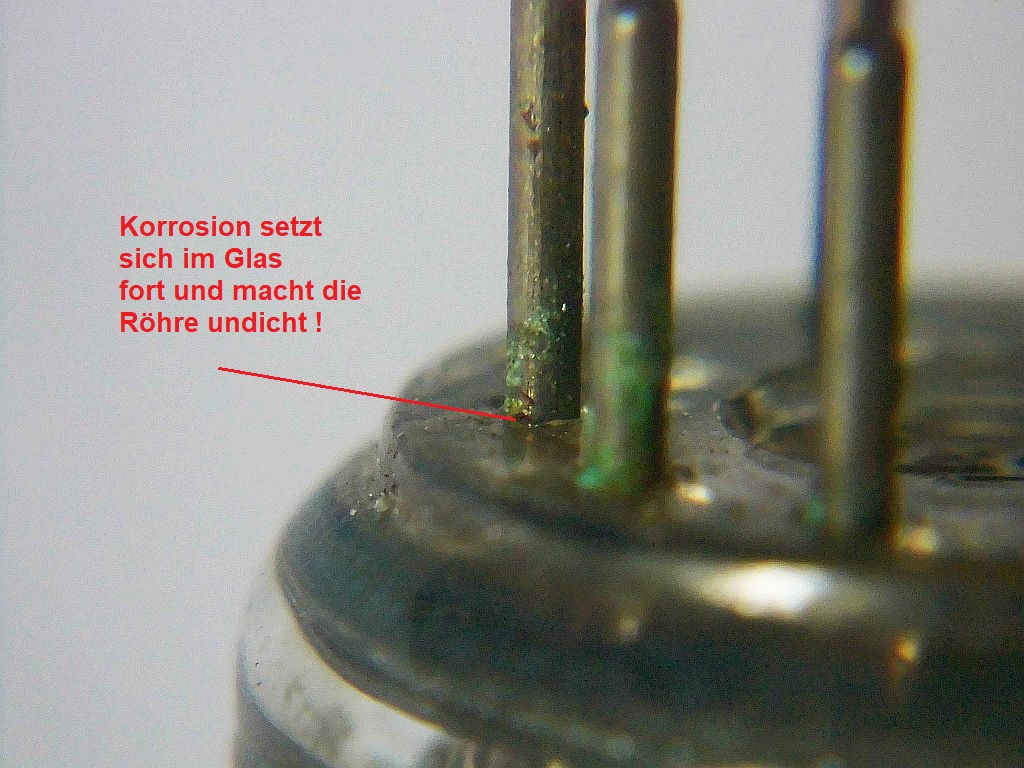 Mit der Lupe erkennt man an den Stiftdurchführungen KORROSION ! An diesen Stellen ist also die Röhre undicht geworden .....