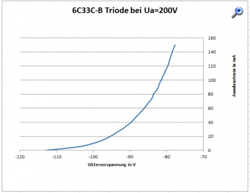 6C33C (oder transkribiert 6S33S) ist eine gute Bekannte für mich. Hab vor Jahren damit SE-Endstufen gebastelt. Die Röhre sieht gut aus, ist aber für sowas gut brauchbar. Nach einem vielstündigen Einbrennen einer fabrikneuen Röhre ist sie dann auch nach einer längeren Anheizzeit (die im Datenblatt angegebenen zwei Minuten sind da sehr optimistisch) relativ arbeitspunktstabil, aber jede anders. Ohne etwas größerem Kathodenwiderstand zur teilweisen halbautomatischen Gittervorspannungserzeugung wird man nicht glücklich. Teilweise, weil die ca. notwendige -50V Gittervorspannung kann man so nicht effizient erzeugen wollen, muss man also einen Kompromiss aus teilweiser fest einstellbarer Gittervorspannung und halbautomatischer eingehen. Stabil ist der Arbeitspunkt dann aber auch nur bei stabiler Heizspannungsversorgung. Viel Spaß beim Messen.