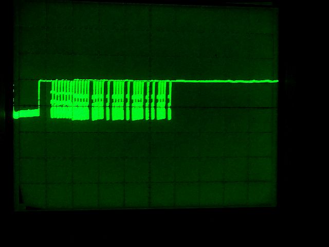 Dazu 50V über 20 MOhm an Katode und Anode gelegt. Das wird dann auf den Vertikaleingang von einem Speicheroszi gegeben. Trigger: Single Sweep. Mit der Fernbedienung eine IR-Pulsfolge gestartet. Bitteschön: