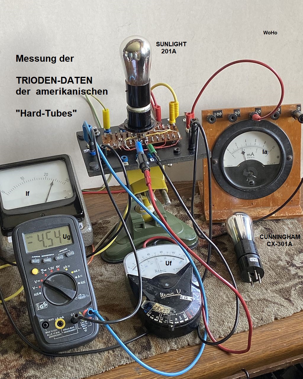 Überraschung: Meine CX-301A kommt mit obiger Einstellung auf 4,0 anstatt 2,5mA! Erst wenn ich die Heizspannung auf 4V reduziere, dann geht der Ia auf 3,5mA zurück. Dann habe ich noch eine Sunlight 201A, welche bei Uf = 5V einen Ia von 2,9mA ergibt und bei Uf = 4V einen Ia von 2,8mA zeigt. Der Vakuumtest ist ok!