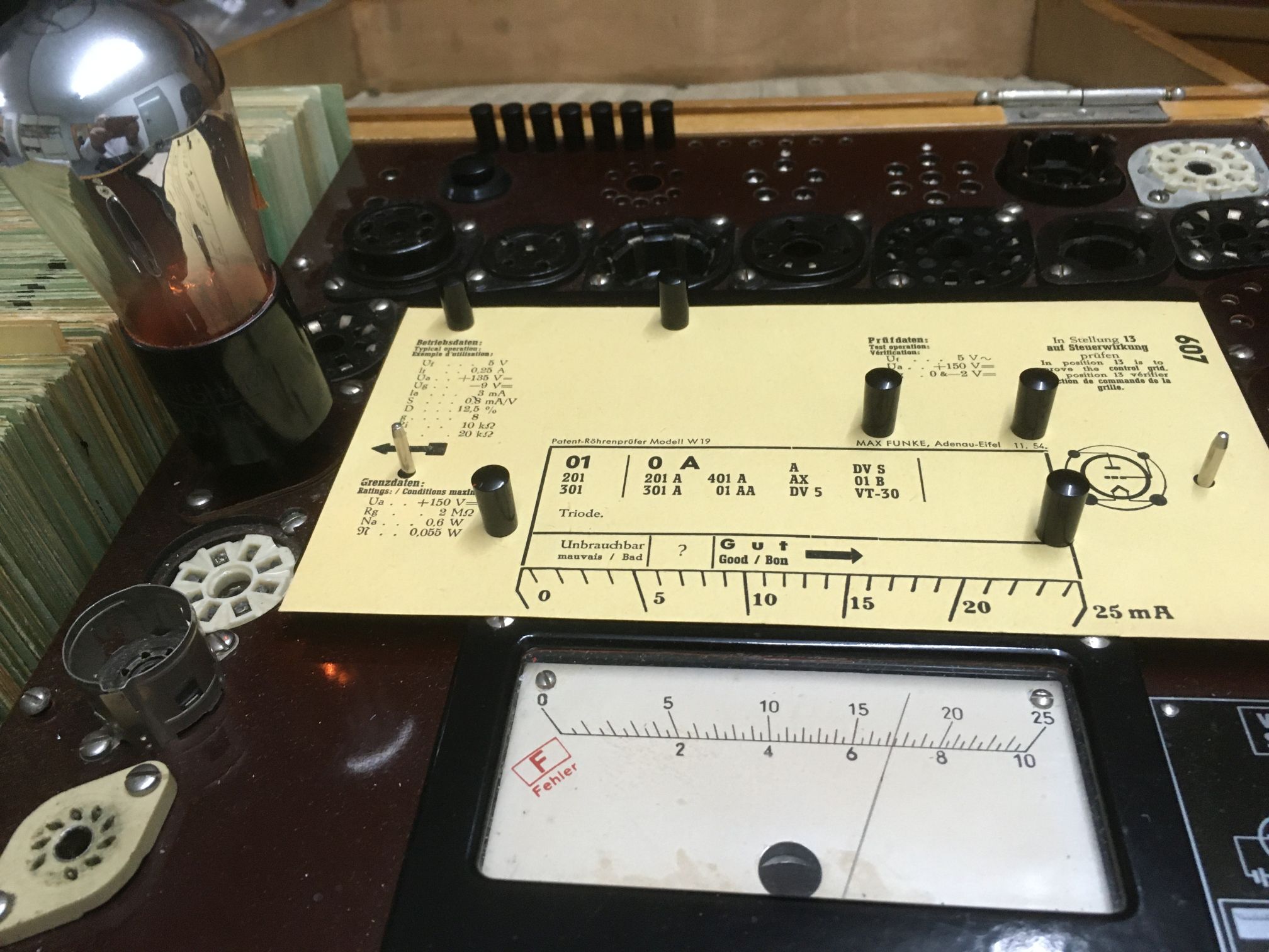 Hat man den Funke W19, dann kann man die Prüfkarte 607 verwenden. Ich habe gerade einmal testweise eine NOS Cunningham CX301A reingesteckt und 17mA ermittelt. In einem alten Dokument las ich 25mA für 100%.