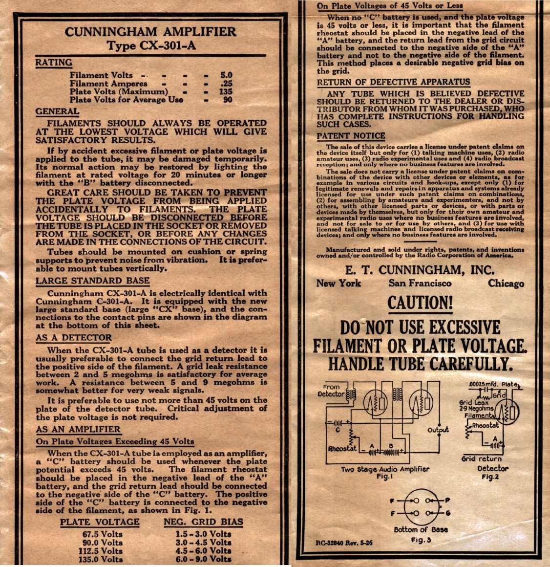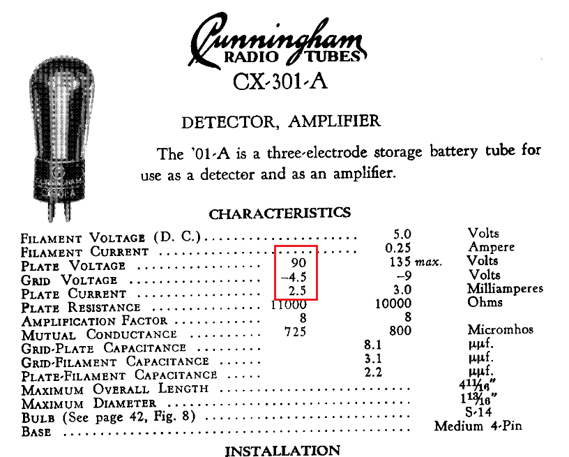 1: Cunningham: CX301A f=5v Vg=-4.5 v Ia= 1mA Ua=90v Vac.test = OK.