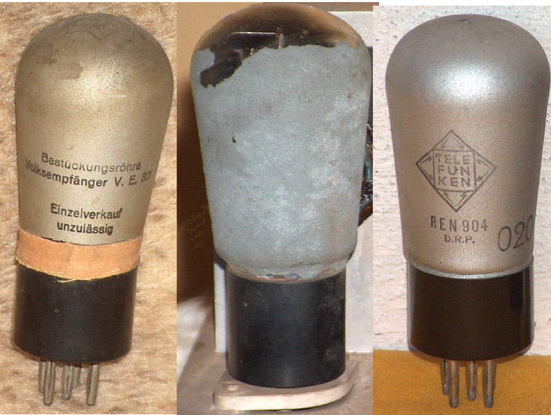 Im einem Volksempfänger VE301 fand ich zwei interessante Röhren vor. Die Gleichrichterröhre RGN354 macht den Eindruck, als sei sie in ihrem Leben einmal repariert worden. Auch die Endröhre, leider mit nicht mehr lesbarer Typenbezeichnung, sieht ungewöhnlich aus. Einzig die Röhre REN904 machte den gewohnten Eindruck, hatte aber keine Typenbezeichnung, weil der Besitzer des VE diese neu mit einem Überzug versehen hat. Über Sinn und Unsinn dieser Maßnahme kann man unterschiedlicher Meinung sein. Ich tendiere dahin, auch einen teilweise abgeblätterten Überzug zu belassen, wenn die normale Funktion der Röhre nicht beeinträchtigt ist. Übrigens gab es in Berlin Biesdorf einen Kleinhersteller, der einen gesockelten Selengleichrichter als Ersatz für die RGN354 anbot. Dieser Betrieb existierte bis Ende der achtziger Jahre und war für mich eine der Bezugsquellen für Tonbandteile.