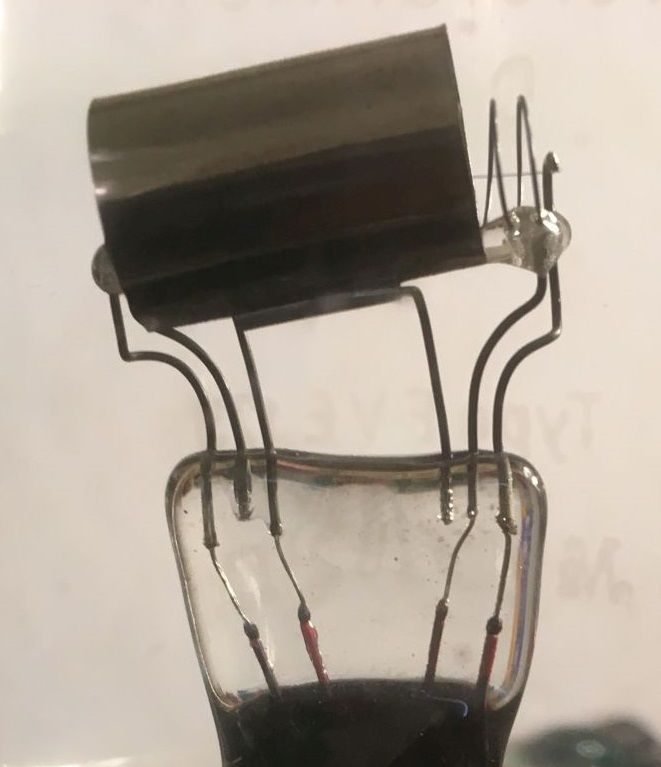 Heute habe ich eine EVE173 #520203/3 vermessen, die einen intakten Innenaufbau hat. Die Anode besteht aus dem eher kritischen Kupfer. Die Thoriumreste scheinen restlos verbraucht zu sein. Dennoch funktionierte die Röhre im Versuchsaudion gut. Ab 700 kHz schwang auch die Rückkopplung.