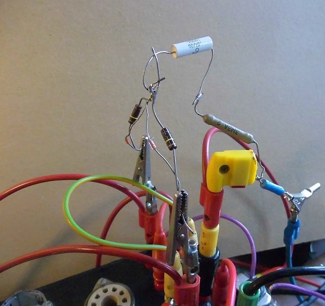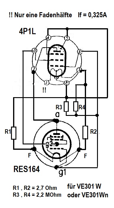 Um die -Ug1 zu reduzieren wurde jetzt jeweils 2,2M vom g1 zu den Fadenenden gelötet. Das hat dann geholfen, den Anodenstrom auf den normalen Wert von 13mA zu bringen. Es ist also ein Spannungsteiler, wobei sich ein Teil außerhalb der Röhre befindet. Das geht für den VE301W und VE301Wn. Damit bin ich zufrieden. Für eine universelle Anwendung des RES164 Ersatzes muss man wohl aufpassen.....