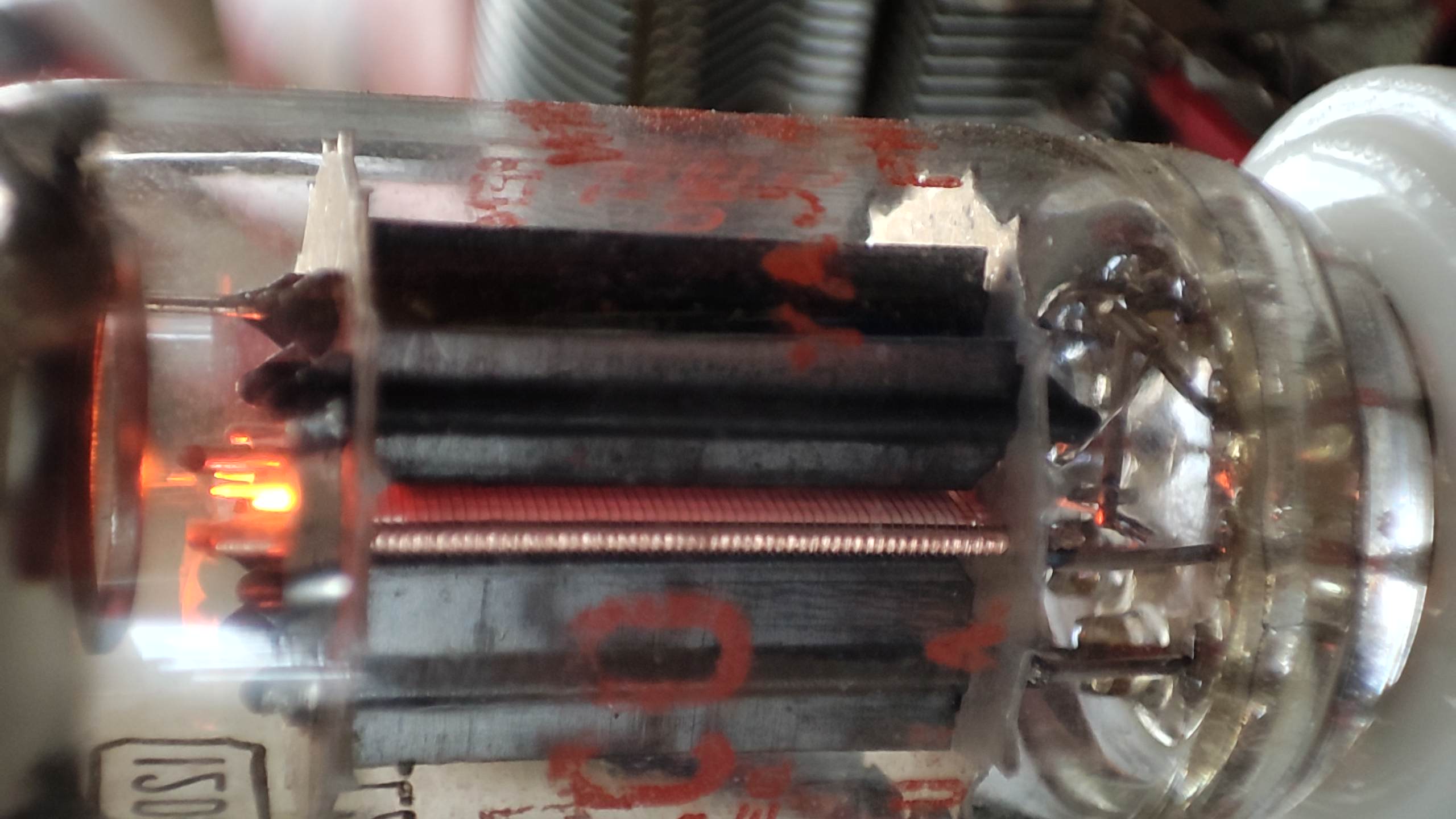 als Nachtrag noch drei Fotos mit glühender Kathode von der 12DW8. Diese Röhre hat zwei NF-Trioden und eine Diode. Die Triode 1 hat mit der Diode eine gemeinsame Kathode. Gelöst wurde dies ganz raffiniert. Die eine Seite der Kathode gehört mit dem Steuergitter, das ebenfalls an den Steugitterstäben einseitig ist und einem Anodenblech zur Triode.