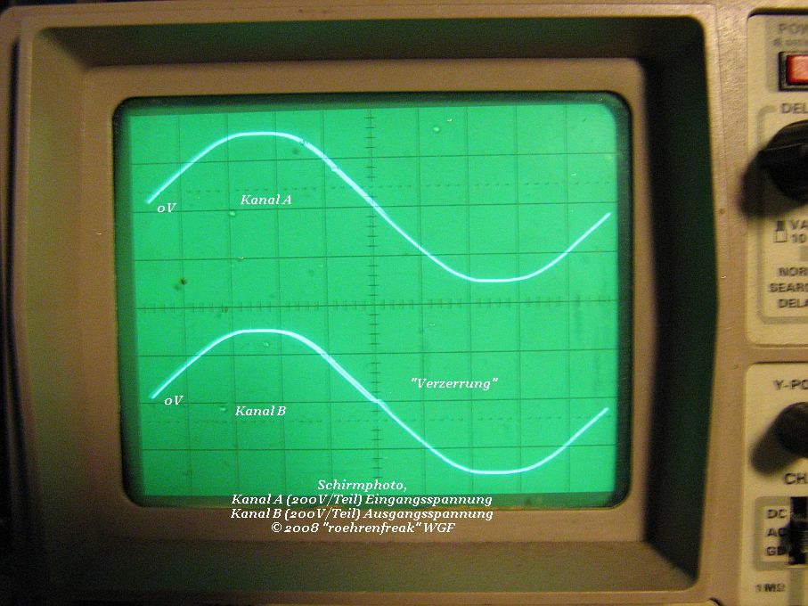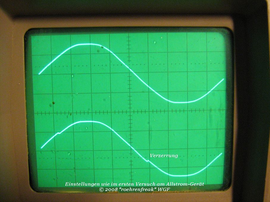 die Versuche sind eben abgeschlossen worden und hier die Ergebnisse in Bildern. Bilder 1 und 2 zeigen die Messungen an einem DKE (Allstromgerät), Bilder 3 und 4 an einem VE301W (Wechselstromgerät). Bemerkenswert: Der Versatz der "Verzerrung" am W-Gerät. Auf den Empfang hatte das keine Auswirkung. Die beiden Z-Dioden müssen jedoch bei Dauerbetrieb auf einem Kühlkörper montiert sein, werden sie bereits am VE301 ohne recht warm. Die gezeigten Versuche wurden selbstredend an einem Regel-Trenntrafo durchgeführt!