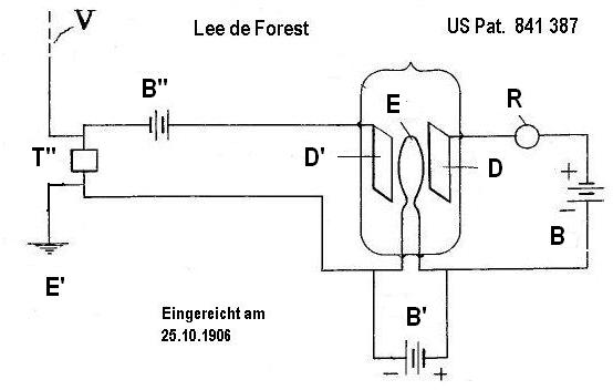 Zitieren:Einen Verstärker mit der Röhre aus dem Patent von 1907 von de Forest habe ich bisher noch nicht gefunden, analog zu den Marconi-Empfängern mit der Fleming-Diode[1]. link wäre schön.