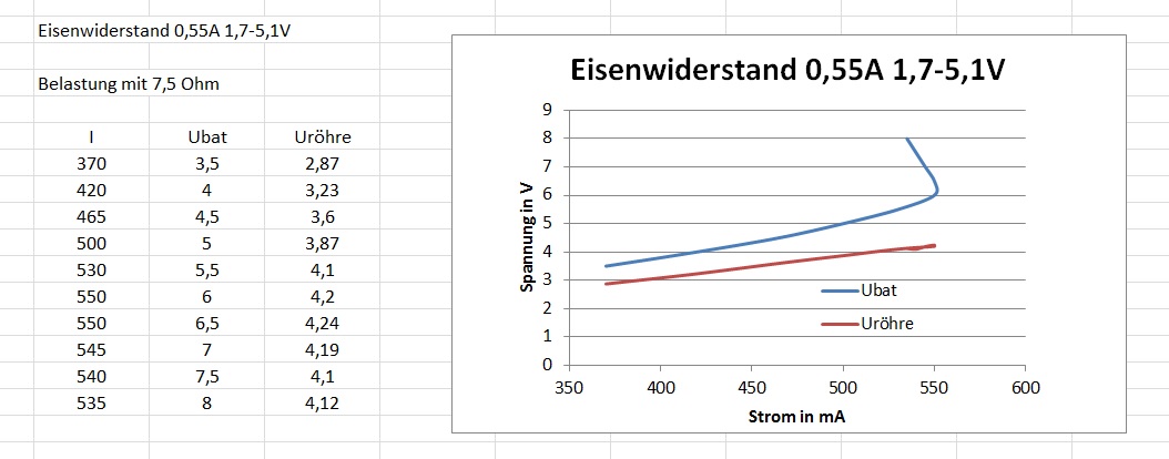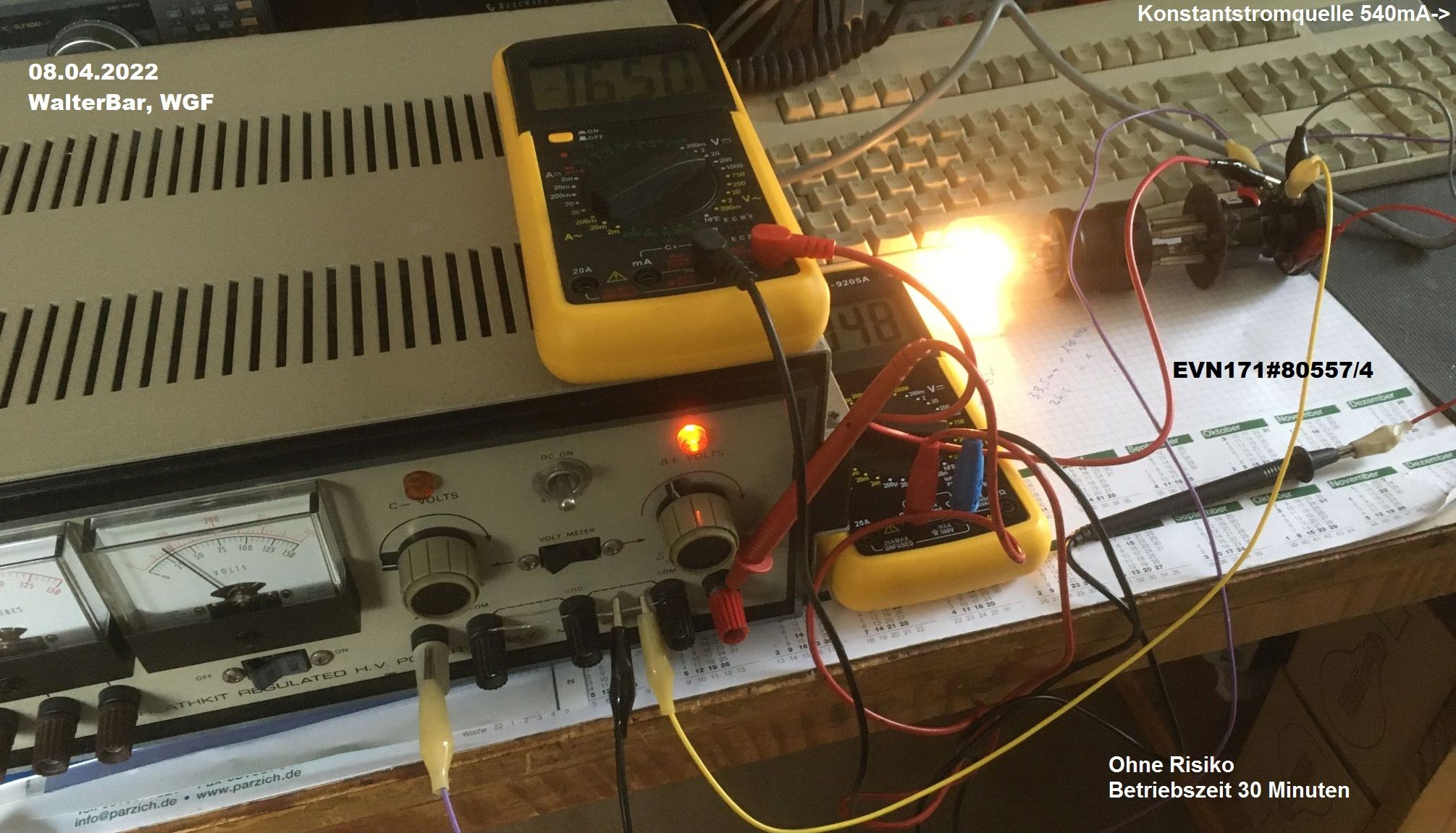 diese ersten Hellgüher mit thorierten Wolframdrähten waren robust konstruiert. Es kam nur auf die Einhaltung des vorgeschriebenen Heizstroms an. Die Produktion schwankte hier zwischen 530 und 570 mA. Es gab Eisenwiderstände in 10mA Abstufungen. Die Röhren wurden immer an 6V Bleiakkumulatoren in Serie zu ausgesuchten Eisenwiderständen geheizt, wie man in den Telefunken-Zeitungen nachlesen kann. In meiner Sammlung habe ich eine 550mA-Type. Weil diese um 10mA zu hoch ist, habe ich ihn nicht mit der originalen EVN171 betrieben, sondern an einem 7,5 Ohm-Widerstand (10W). Es ist zu erkennen, dass der Strom nicht über den Nennwert steigt.