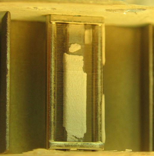 die rasante Entwicklung der Rundfunk- und Fernsehtechnik nach dem Kriegsende führte zu immer neuen, leistungsfähigeren Röhren. Nicht nur die Grösse schrumpfte auf weniger als ein Zehntel früher üblicher Glaskolben, die eher an Glühlampen erinnerten. Einhergehend damit stiegen Verstärkungsfaktor und Grenzfrequenz, die Rauschziffer und Systemabmessungen nahmen dramatisch ab. Zu den grössten Fortschritten in der Röhrentechnik gehört die Entwicklung der so genannten "Spanngitterröhre". Das war absolut "HiTech". Der Gitterdraht aus einer speziellen Chrom-Molybdän-Legierung ist dünner als ein Frauenhaar, in einem besonderen Verfahren mit den formsteifen Stegen verschweisst. Die im Bild dargestellte Röhre ist eine (defekte) PCC88. Sie wurde vom Glaskolben befreit und das äussere Anodenblech eines der beiden Triodensysteme entfernt, sodass der Blick auf das Systeminnere frei wurde. Gut sichtbar sind die Schäden an der Kathodenbeschichtung infolge der Alterung.