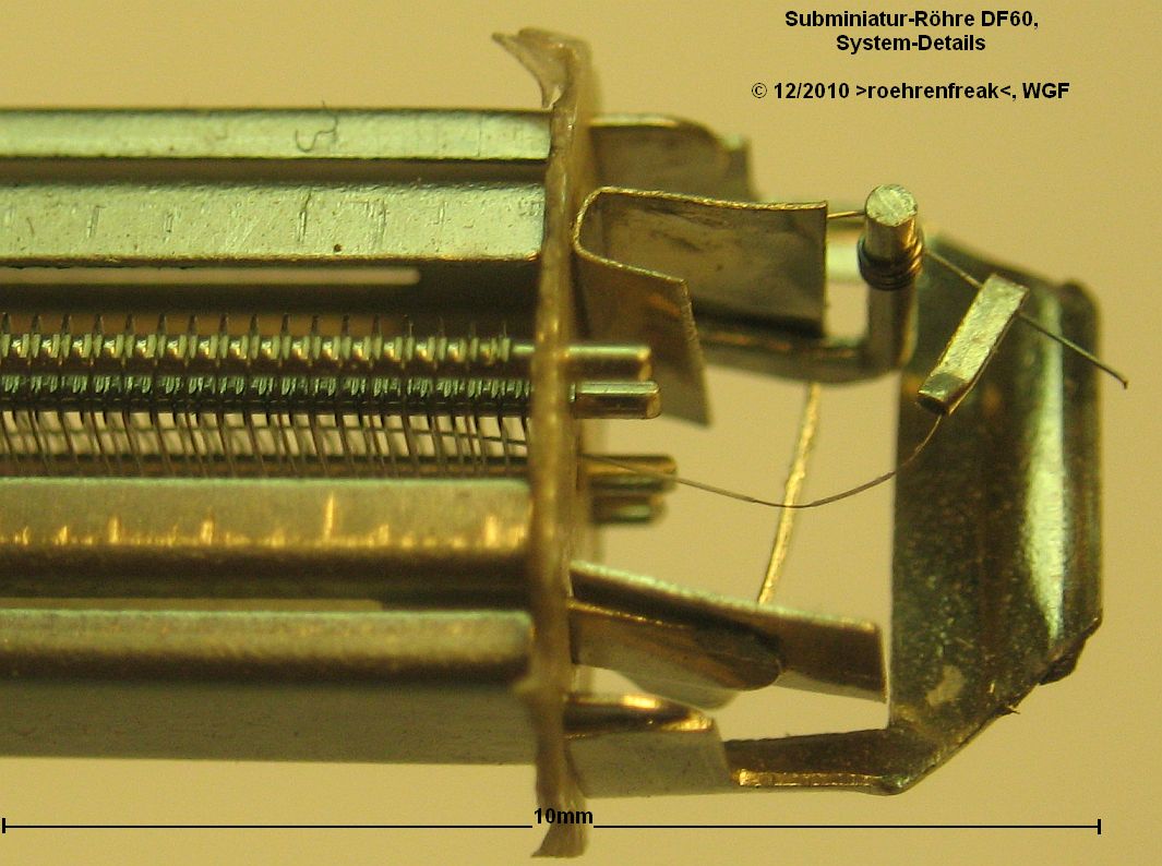 In den letzten Jahren wurde der Markt von Subminiaturröhren sowjetischer Herkunft geflutet. Anfangs für wenige Cent erhältlich entwickelten sie einen schnell wachsenden Freundeskreis, den sie zur Entwicklung und Bau kleiner Vollröhrenradios inspirierte. So entstand in meiner Werkstatt ebenfalls ein kleiner MW-Super, der sich bis heute sehr gut bewährt hat. Eines der "Opfer" aus der Entwicklungsphase habe ich einmal entmantelt und war von dem feinwerktechnischen Kunstwerk vollkommen fasziniert. An dieser Faszination möchte ich Euch teilhaben lassen und habe das System einer defekten DF60 im Detail einmal abgelichtet.