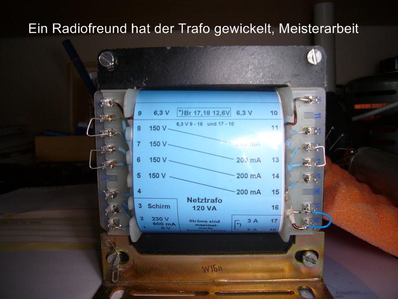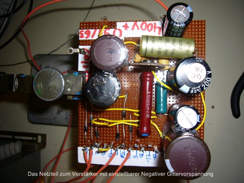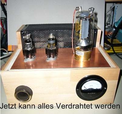 Wenn eine Fassung nicht verfügbar ist, oder zu teuer, hier ein Basteltipp: Ich hatte ein Stück Pertinax übrig.(Rund wäre schöner gewesen) In diesem habe ich die Löcher mittig zu den Kontakten der Röhre mit einem 8- mm-Bohrer gebohrt. In die Löcher kommen Kabelverbinder/Rundsteckhülsen. Diese haben einen Schlitz, sodass die Röhrenstifte Perfekt hineinpassen und einen sehr guten Kontakt bilden. Der nächste Schritt ist das Versorgungsnetzteil mit Ua 400 V, Ug2 200 Volt und Ug1 wird über ein Poti auf ca. 63 V eingestellt. Alle Röhren benötigen 12,6 V, das ist auf dem Trafo schon berücksichtigt, max. 3 A. Der Probelauf ohne Vorstufe ist gelungen. Kathode, Gitter an Masse, anstelle des 300 R. (Negative Gitterspannung ist ja da.) Ug1 470 k bleibt und 5 k nach dem Nf-Eingang von 0,22 µF. Vom Netzteil aus (Poti) ist die Ug1 auf -30 V eingestellt. Ug2 bekommt beim Einbau des ganzen noch einen 0,1-µF-C mit 500 V gegen Masse. Die RL12P35 nimmt bei 400 Volt 48 mA. Der AÜ sollte nicht mehr als 4 kOhm haben. Der Test verläuft sehr gut mit schönem Klang aus einem Lautsprecher, den ein Radiofreund spendiert hatte. Angeschlossen habe ich einen Plattenspieler. Datenzur Röhre h t t p://www.hts-homepage.de/Wehrmacht/Heer/WMRL12P35.html DIE BLANKEN "HÖRNER" DER RÖHRE = ANODE - SIND (ist) ISOLIERT WORDEN
