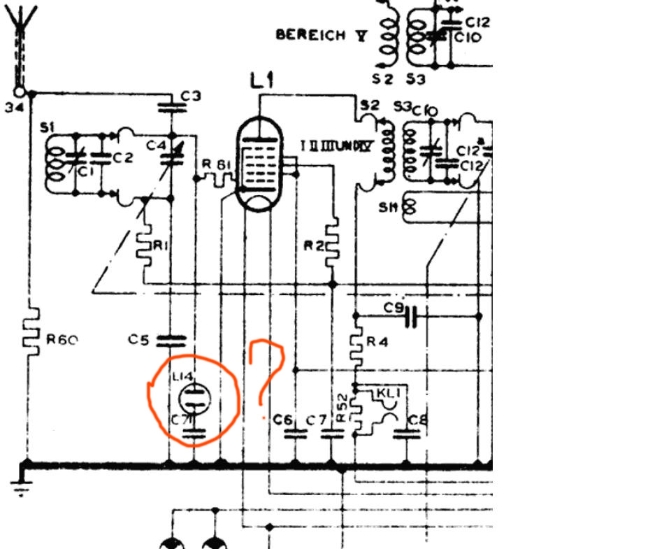 Die L14 sieht wie eine Glimmröhre aus, jedoch fehlt im Schaltplan der Punkt, der angibt, dass die Röhre mit Gas gefüllt ist. Vielleicht ist es aber auch nur ein Überspannungsschutz, also zwei Elektroden im Glasgehäuse ohne Gasfüllung. So ein überspannungsschutz hat ja nur ein paar pF und wird deshalb den Schwingkreis nicht stark beeinflussen. Was ich allerdings nicht verstehe, wozu ist der in Reihe geschaltete C71 gut?