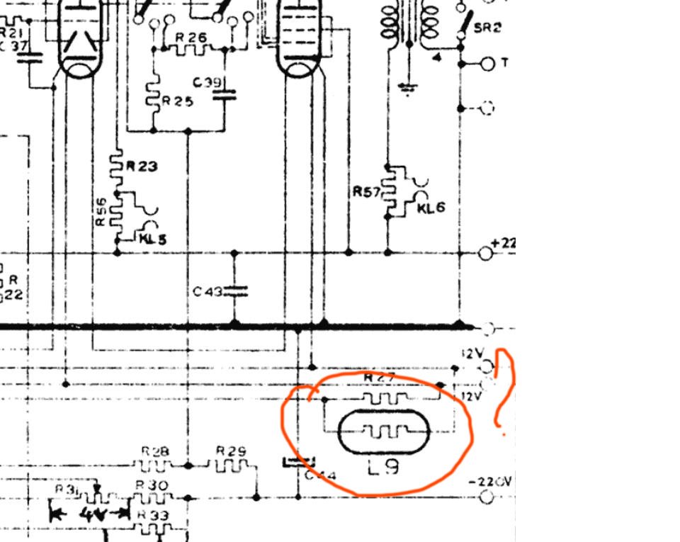 Bei L9 tippe ich auf einen nicht linearen Widerstand (Urdox?) der Regelaufgaben wahrnimmt, sicherlich für den Strom der Röhrenheizung.