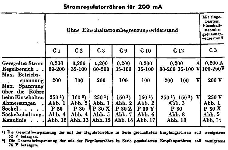 Etwas stutzig machen mich die Spannungsangaben auf dem Schaltplanausschnitt. Für normale 200 mA Regler ist die Spannung zu niedrig. Es sieht außerdem wie eine Parallelschaltung aus. Es gab allerdings Regler für niedrige Spannungen, die waren aber nicht für 200 mA. Deshalb eine Liste der Philips Stromregulatorröhren von 1940 für 200 mA, ich kenne ja nicht den ganzen Heizkreis ob das doch noch hingekommen wäre.