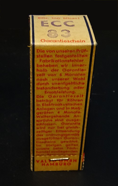 Rainers ECC83 ist ja schon richtig alt! Das Kartonmaterial (grobfaserig und stärkere Vergilbung durch höheren Säureanteil) und Design von Valvo als Schriftzug und Farben - schätz mal Mitte oder späte 50er Jahre. Mich würde nicht wundern, wenn das noch eine Glastellerboden "Münze" Röhre ist! Öffnen würde ich sie auch nicht.