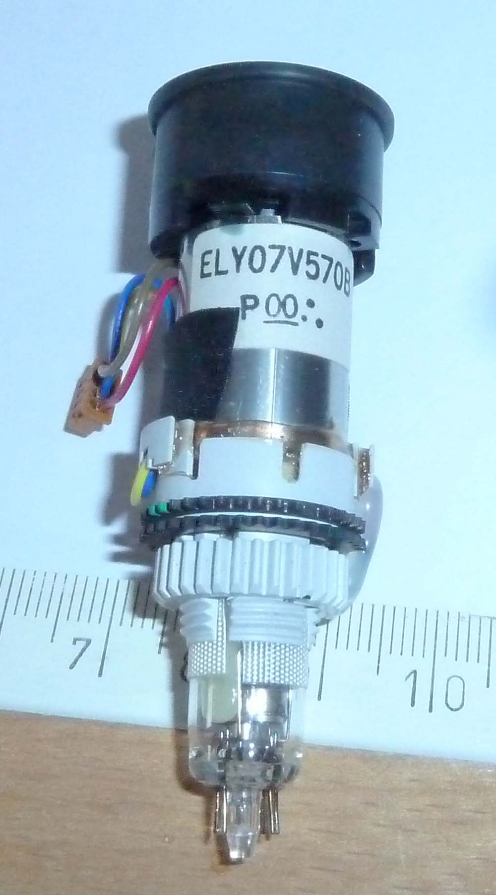 Die Bilddiagonale beträgt ca. 13mm, das Bild ist schwarz/weiss. Die Auflösung (Strahldurchmesser) entspricht einem PAL-Bild ohne Einschränkung. Da der Fotoapparat hoffnungslos überfordert war, habe ich leider kein Bild. Die Ablenkung ist magnetisch, der Anschluss erfolgt über die 4 farbigen Litzen. Die übrigen Anschlüsse sind unten auf den Sockelstiften, wegen der niedrigen "Hochspannung" von ein paar 100V ist auch dieser Anschluss unten, aber mit Abstand zu den übrigen Stiften. Die Kathode ist wohl direkt geheizt, es gibt keine merkbare Anheizzeit. Das Datenblatt habe ich noch nicht gefunden, aber dafür Verkaufsangebote.
