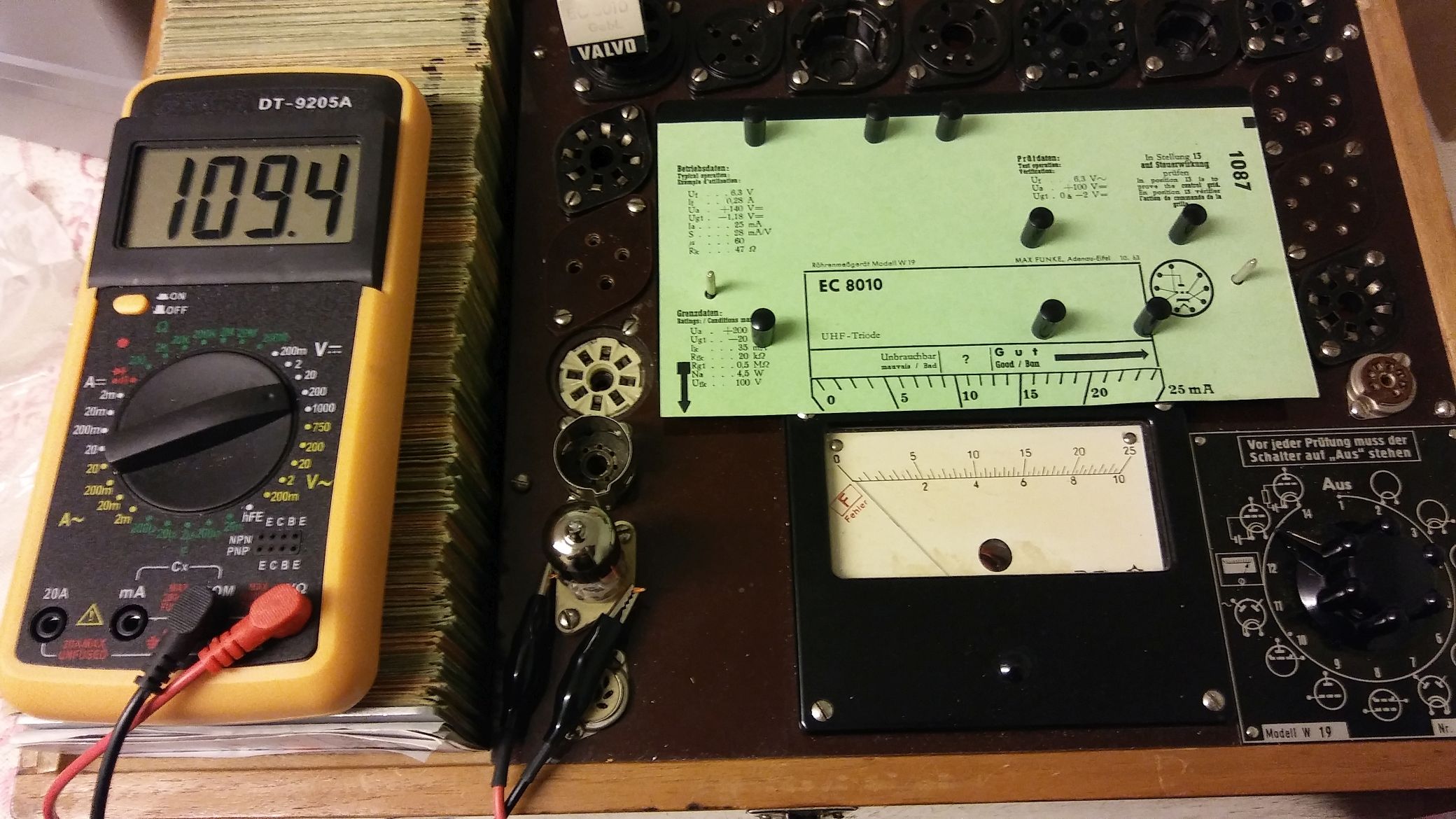 Ich habe die Röhre im Funke kurzzeitig mit 150 und 200 Volt belastet und bekam die Anzeige 50 und 80 mA. Es ist durchaus möglich, dass die Röhre ihre 10.000 Stunden schon gebrannt hat. Es war damals gängige Praxis, die Röhren nach genau einem Jahr auszutauschen, wenn sie im Dauerbetrieb waren.
