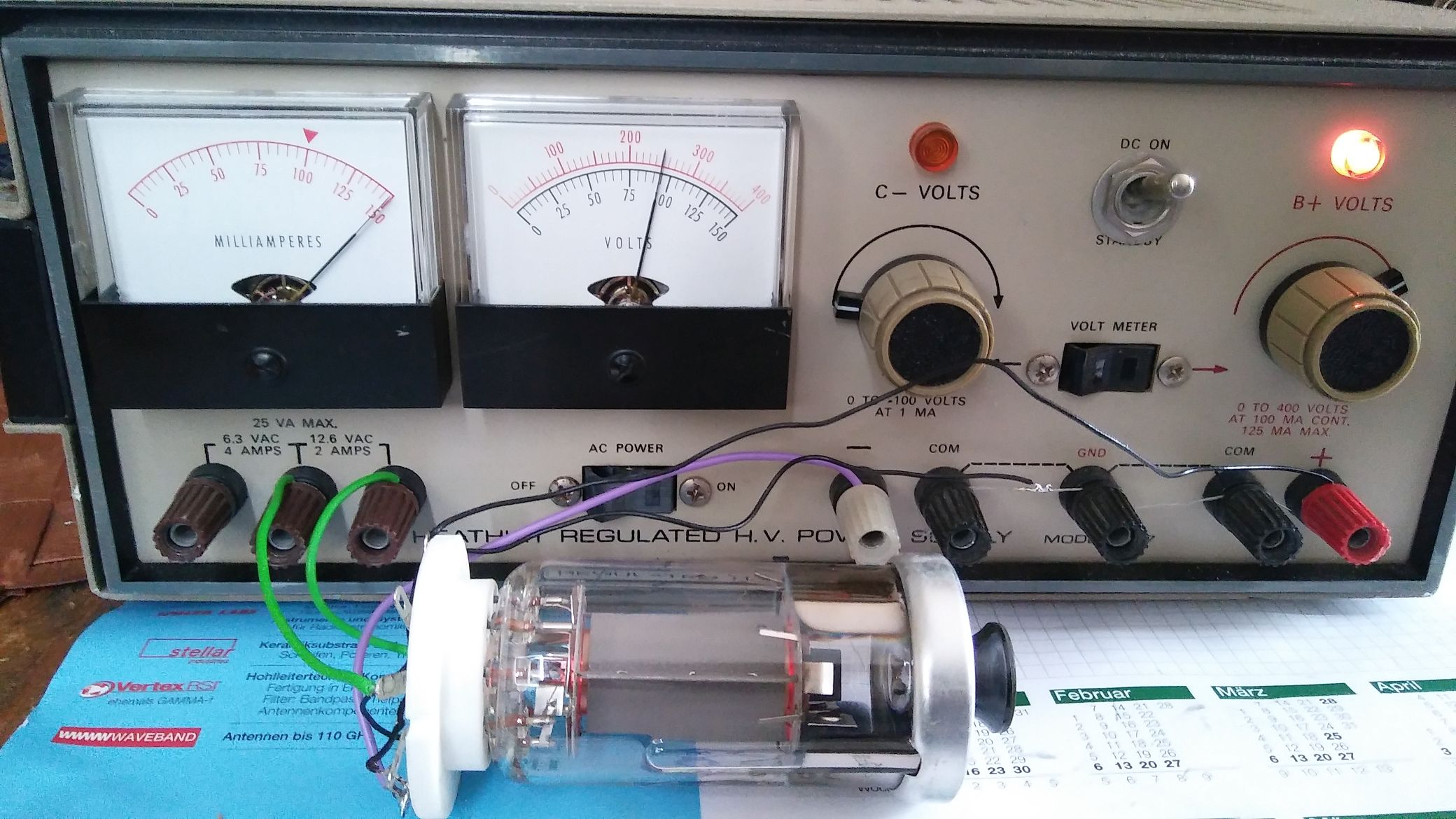 Ohne Gittervorspannung zog die Röhre übrigens noch bei 50 Volt Anodenspannung 35 mA Strom.