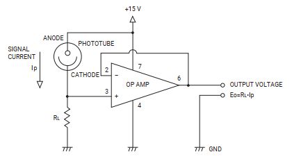 Phototubes betreibt man in Durchlassrichtung und nicht in Sperrichtung wie bei Halbleiter-Photodioden. Hierfür sollte man ca. +15V an der Anode, oder -15V an der Kathode anlegen. Je nach Sensor kann der mittlere Strom bis in den einstelligen uA-Bereich gehen. Der Strom ist aber auch abhängig von der Grösse der Photokathode! Angegebene Daten beziehen sich immer auf eine voll ausgeleuchtete Photokathode!