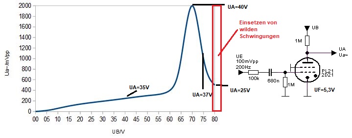 Bisher war es nur mit sehr hohen Anoden-Widerständen möglich, die PL21 annähernd an dem genannten Punkt zu betreiben, ansonsten tat sie das, wofür sie gebaut wurde: Sie schaltete durch und die Anodenspannung musste dann sehr stark abgesenkt werden.
