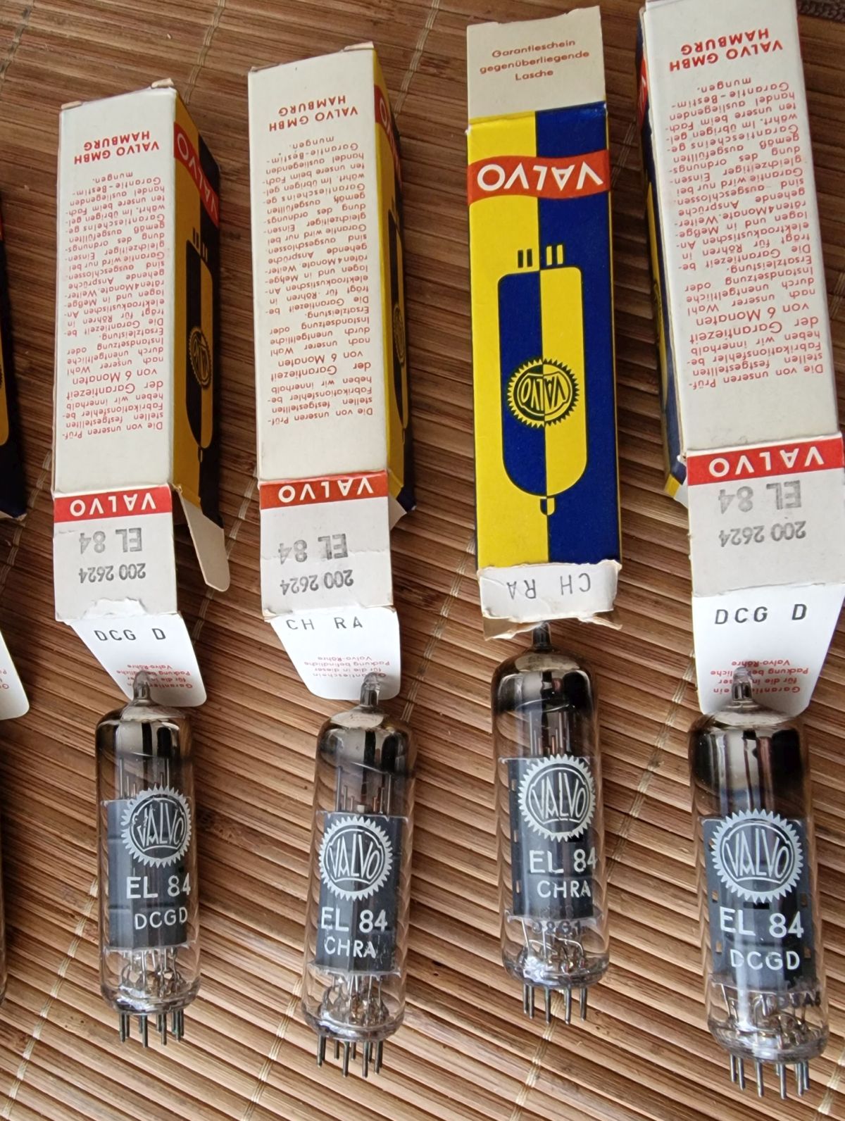 habe hier ein paar Valvo rx3 EL84 in der blau/gelben Schachtel "Valvo GmbH Hamburg". Die Schachtel ist wirklich alt (Papier, Geruch - und damit meine ich nicht Schimmelkeller)....stellenweise etwas Grünspan an den Anschlußpins, also alles passt! Wären da nicht fehlende Gitterkühlfahnen. Meßtechnisch passt auch alles. Erreicht problemlos den Strom von 48mA im Neuberger Test bei Ug1 -7,3V und je 250V an Ua + Ug3. Produktionsfehler oder was ist da los?