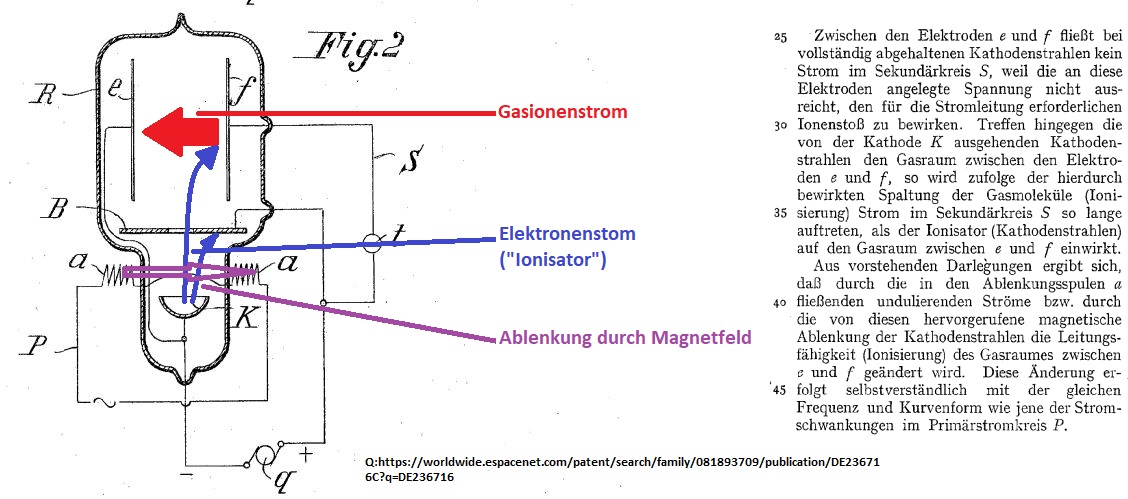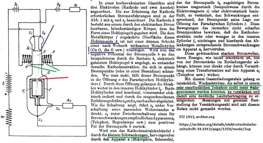 Was der Laie als "untauglichen Weg" bezeichnet, entpuppt sich als eine komplexes Röhrensystem, das seiner Zeit weit voraus war: - Es wird die kurz zuvor erfundene Wehnelt-Kathode verwendet, beschichtet mit einem hochemmissionsfähigen Material (Bariumoxid), welches bis zum Ende der Röhrenära verwendet wurde. - Es wurde nicht die Leitfähigkeit eines Gases benutzt (Damit konnte de Forest in seinem "Audion" eine wesentliche Steigerung der Empfindlichkeit gegenüber dem "Fleming-Ventil" erzielen), sondern ein Elektronenstrahl, wie in den späteren Hochvakuum-Elektronenröhren (Landläufig: "Radioröhren").