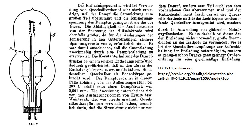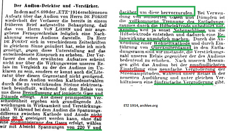 --- Quellen: "Neues Verfahren zur Verstärkung elektrischer Stöme", Abdruck eines Vortrages v.14.10.1913, ETZ 1913 vol.34 Heft 48 h t t p s://archive.org/details/elektrotechnische-zeitschrift-34.1913/page/1359/mode/2up Da Disput mit de Forest und auch späteres de Forest-Audion als Verstärker beschrieben s.a. ETZ 1914 vol 35, Suchbegriff "Forest" https://archive.org/details/elektrotechn...ift-vol-35-1914