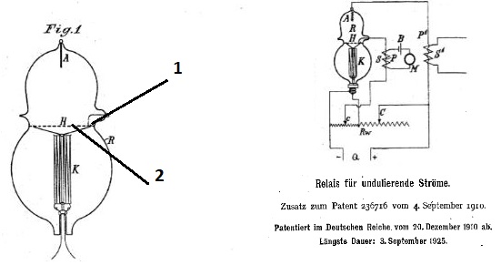 Im Jahr 1910 wurde dann der Durchbruch erzielt, als Patentquellen stehen zur Verfügung: h t t p s://worldwide.espacenet.com/patent/search/family/081893709/publication/DE236716C?q=DE236716 (Patentiert vom 04.09.1910, noch ohne Steuergitter) h t t p s://worldwide.espacenet.com/patent/search/family/085979283/publication/DE249142C?q=DE249142 (Zusatzpatent zum vorstehenden, Patentiert vom 20.12.1910