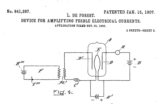 Nur drei Monate später erfolgte ein deutlicher Fortschritt: Mit US Pat. 879532 vom Januar 1907 kam die Einsicht, mit einem Gitter in Form eines Zig-Zag gebogenen Drahtes zwischen dem Faden und der Anode lassen sich die Elektronen viel besser steuern. Diese Methode wurde der Standard bis in die Neuzeit.