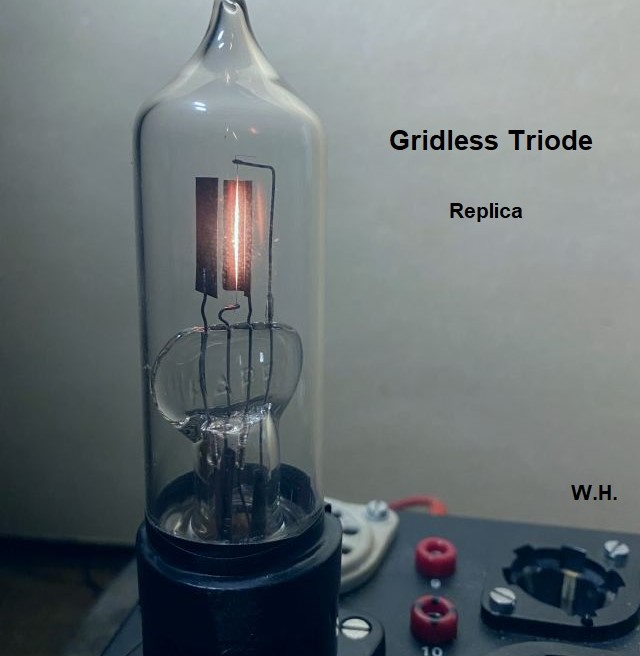 Wir sehen als Steuerelement eine Metallplatte in der Nähe des Fadens. Auf der anderen Seite ebenfalls eine Platte, welche die Funktion der Anode übernimmt. Die „Gridless Triode“ war geboren!