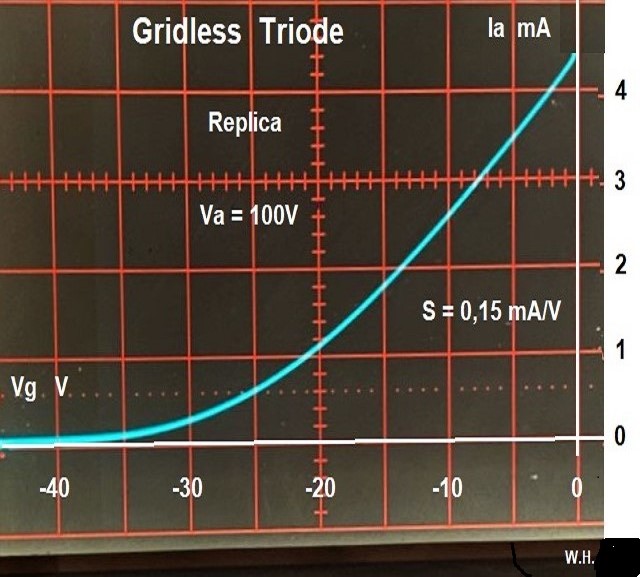 Es ist ein Hellglüher mit Wolframfaden. Letzterer liegt in einer halbrunden Einkerbung der Steuerplatte, so wie das beim „Plation“ von HUTH gemacht wurde. Für das Foto wurde die Heizung stark reduziert, sonst wäre ja alles überstrahlt. Untenstehende Kennlinie zeigt deutlich die sehr geringe Steilheit: