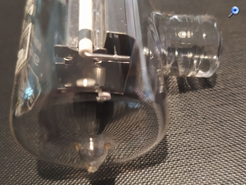 Bei genauem hinschauen kann man im mittleren Teil kleine Pünktchen erkennen. Ich vermute, dass es sich hier um Quecksilber handelt, das man mit den heissen Glühfäden verdampfen lässt, damit die Lampen starten. Natürlich müssen auch diese Lampen mit einem Vorwiderstand betrieben werden, denn wenn man die Startspannung erreicht (bei der das Quecksilber verdampft), dann würde die Lampe sonst im wahrsten Sinne des Wortes abdampfen. Wenn die Arbeitsspannung zu hoch ist, dann wird die Lampe nach kurzer Zeit innen schwarz.
