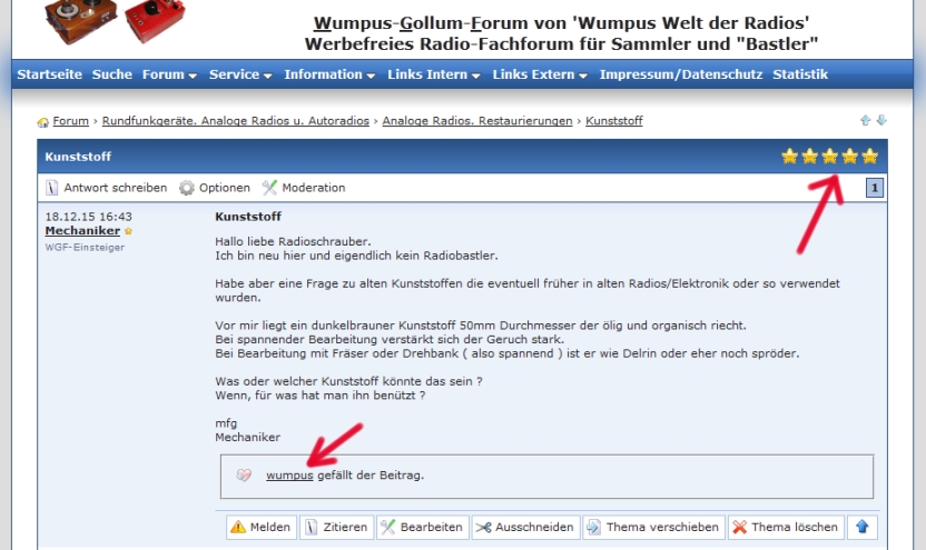 Es gibt noch eine weitere Bewertungsfunktion, die "Sterne 1-5" immer rechts oben bei einem Thread. Auch hier kann man als Eingeloggter (wenn nicht schon früher geschehen) 1 - 5 Sterne anonym vergeben.
