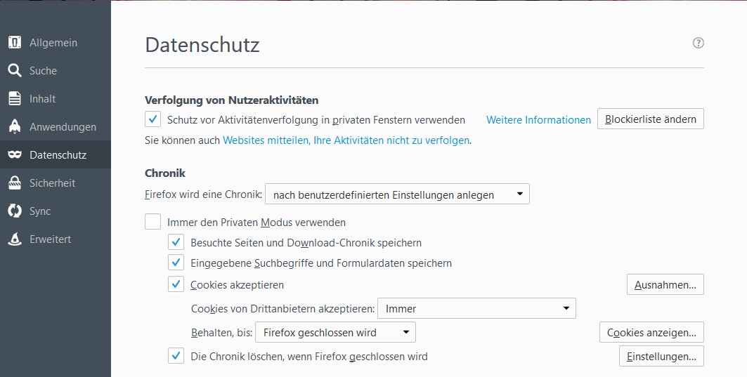 Firefox bietet eine halbwegs praktikable Teil-Lösung an: Man kann den Browser so einstellen, dass er alle Cookies am Ende einer Session löscht. Also, dann kann man nach einer Aktivität nach der Sitzung den Browser einmal schließen und alle Cookies sind weg. Ich mache das immer so. Wo das geht? Einstellungen, Datenschutz:
