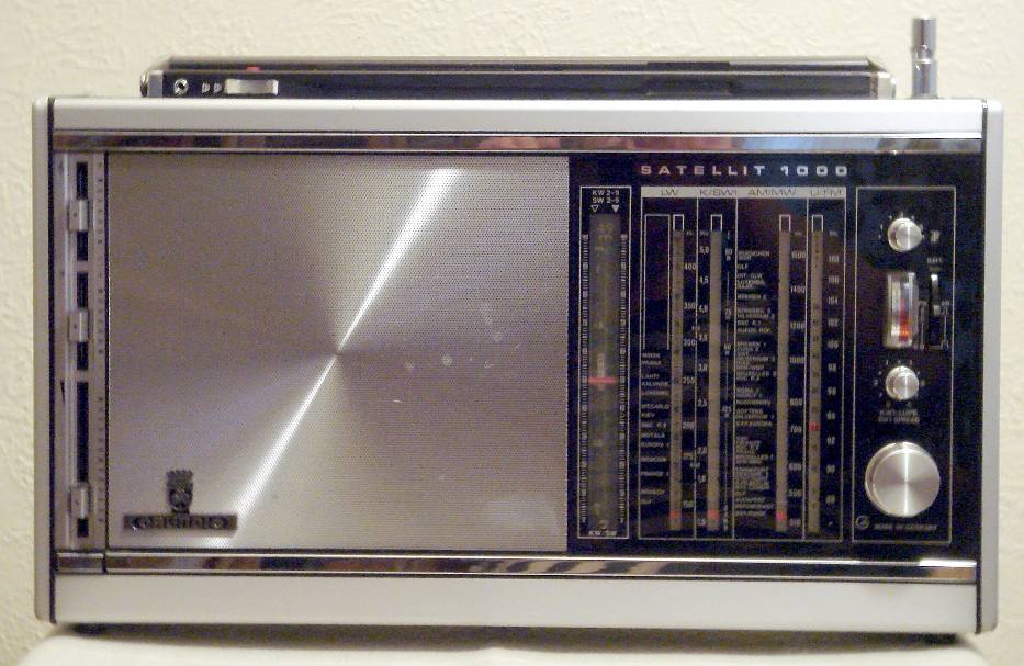 Herst. : Grundig Mod. : Satellit 1000 Jahr : 1972 - 1973 Bes. : LW, MW, KW (9 Bänder mit Spreizung), UKW, Zubehör: SSB-Empfangsteil Bem. : Netz- und Batteriespeisung (6 x 1,5 ), Thermoplastgehäuse, Kofferradio, Super mit Doppel- und Dreifachmischung, 8 Tasten, Trommelturner, und und