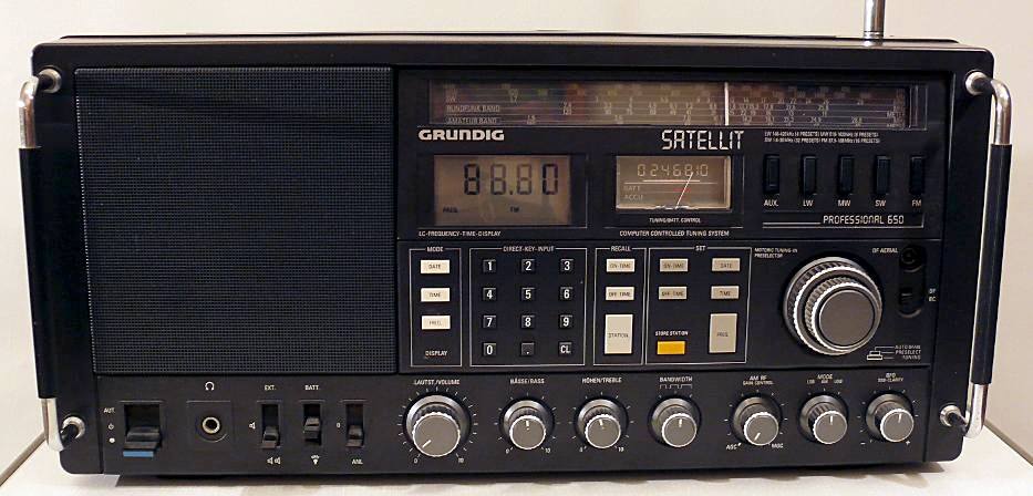 Herst. : Grundig Mod. : Satellit 650 Professional Jahr : 1986 -1991 Bes. : LW, MW/ KW (durchgehend von 510 kHz bis 26,1 MHz) und UKW, SSB mit BFO Bem. : Netz- und Batteriespeisung (6 x 1,5 V), Thermoplastgehäuse, Kofferradio, Super mit Doppel-/Dreifachmischung, Mikroprozessor und und