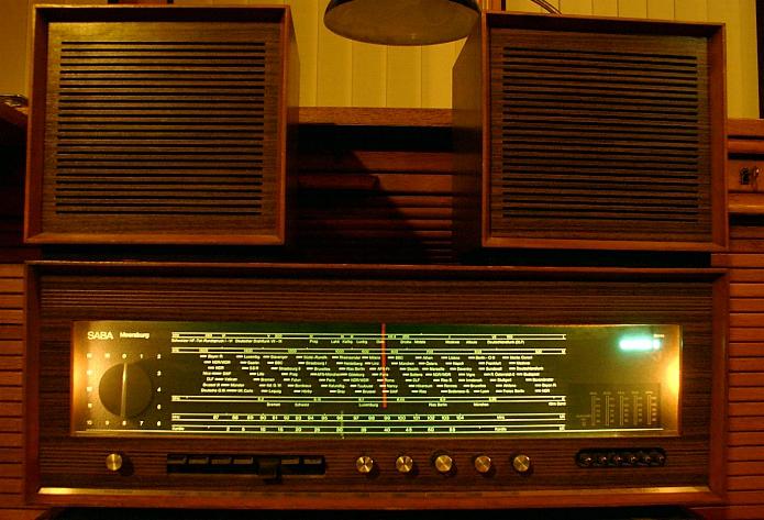 ...und der Vollständigkeit halber: Das SABA Meersburg Stereo aus der Mitte der 60er Jahre mit zwei separaten Lautsprechern in einer Größe. Es bildet quasi den Übergang von den hochglanzpolierten und mit Zierleisten bestückten "Edel" Radios aus den 50ern zu den schlichten modernen Radios. Der Klang ist sehr gut und kräftig, trotz der (nur) zwei Lautsprecher.