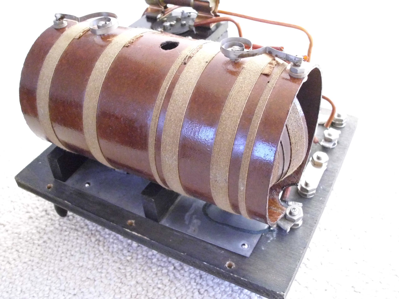 Eine Überrestaurierung kam nicht infrage. Aber die Suche nach einem Ersatz für die fehlende Gitterkombination war schwierig. Letztlich habe ich die Keramik-Fassung für einen Eisen- Wasserstoff-Widerstand aus den 1920'er Jahren für eine EVN171 genommen. Die übrige Instand- setzung war an einem Vormittag erledigt. Gestern Mittag habe ich den Empfänger nun in Betrieb genommen und war von der Empfindlichkeit angetan. Wawre 621 kHz war sehr laut, Solt/Ungarn auf 540 kHz (in der Mittagszeit!) und einige Engländer waren gut verständlich. Die Dimensionierung und Güte der Variometer ist herausragend. Ich habe noch nie mit einem Ein-Röhren-Audion kurz vor dem Rückkopplungseinsatz das Antennenrauschen hören können. Zwar auf Kosten der Selektivität ist halt die Verwendung eines Serienresonanzkreises immer dann anzuraten, wenn es um höchste Empfindlichkeit geht, denn Kopplungsverluste zur Antenne bestehen so nicht. Mein Chelsea No101 aus der gleichen Zeit macht das ebenfalls so.