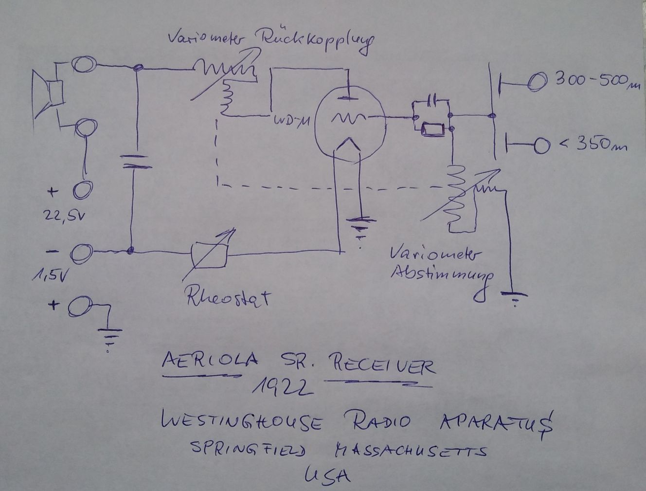 Beide Variometer (Abstimmung und Rückkopplung) lassen sich zwischen ca. 100 und 400 µH abstimmen. Die Schwingkreisfestkapazität beträgt 470 pF für 350 bis 500m und 90pF für < 350m. Datenblätter für die WD-11 raten zu einer Gitter-R/C-Kombination von 250pF und 2...3M Ohm. Ich habe den Wert 2,7 M Ohm gewählt. Den Wert des Kopfhörer-Kondensators habe ich mit 5,5 nF gemessen. Der Heiz- Drehwiderstand hat einen maximalen Wert von 5 Ohm. Ich bin mit einer Bleizelle von 2 Volt besser zurecht gekommen als mit einer empfohlenen Trockenzelle von 1,5 Volt. Der Heizstrom sollte mit einem mA-Meter auf den Sollwert von 250mA überwacht werden. Der typische Lautstärkeverlauf einer Wolframröhre liegt nicht vor. Die WD-11 hat schon eine Oxid-Kathode, und die Rheostat Einstellungsanweisung von Westinghouse bezüglich Dunkelglut ist absurd. Es wundert mich nicht, warum so viele Röhren zwischen 1921 und 1923 verheizt wurden und Westinghouse bzw. der Nachfolger RCA zu einem Umbau auf UV-199 oder ähnliche Trioden riet. Ich habe auf U-Tube auch 3 Videos gesehen, in denen die stolzen Vorführer des Aeriola völlig planlos den Heizungsregler hin- und her und bis zum rechten Anschlag gedreht haben. Bei meiner WD-11 gibt es zwischen 200 und 250mA im Gegensatz zu Röhren mit Wolframheizfäden keinen Lautstärkeunterschied.