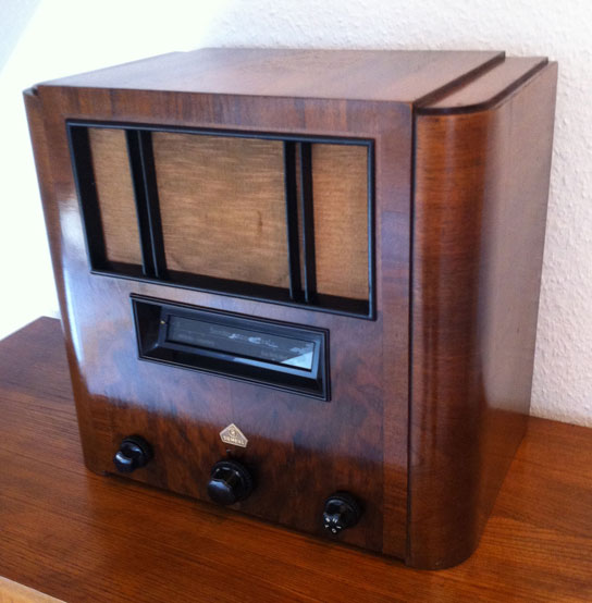 Zur Technik: es handelt sich um einen Dreikreis-Vierröhren-Empfänger aus dem Baujahr 1933/34. Das Gerät ist baugleich mit dem Admiral 346WL von Telefunken, bzw, dem Ultra-Geadem 304WL von AEG. Die Bestückung ist: RGN 1064 / 2x RENS 1234 / REN 914 und RENS 1374d. Das Gerät verfügt über einen manuell einregelbaren Schwundausgleich (mittels Poti auf der Rückseite). einem Orts- / Fernschalter (durchaus nützlich), TA-Eingang zur Triode, Klangfarbenregler und den Empfangsbereichen Mittel- und Langwelle.