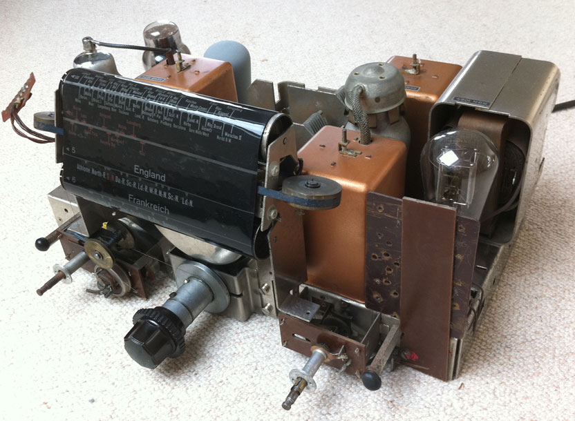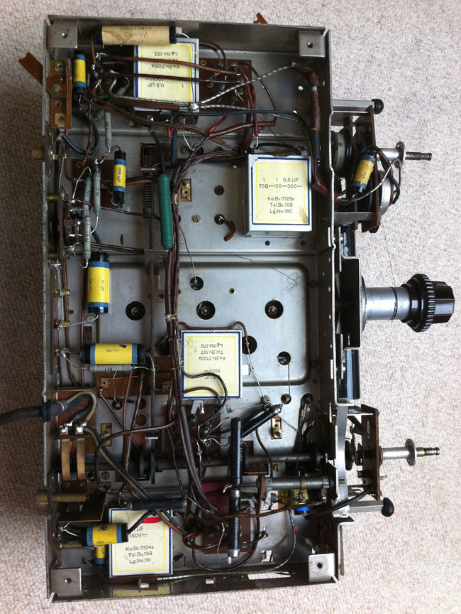 Mit Ausnahme von zwei Becherkondensatoren, deren Schränklappen unter dem Trafo, bzw. unter dem Drehko enden und die sich deshalb einem Ausbau heftig wiedersetzen, sind alle C´s ausgehöhlt und mit neuen Exemplaren neu befüllt worden - ich gehöre der Fraktion von Sammlern an, die auf einen möglichst originalgetreues Erscheinungsbild Wert legen (die Diskussion im Forum ist wohl bekannt). Ausgefallene Widerstände sind durch passende Originale ersetzt worden. Ansonsten sind Chassis und Gehäuse auch optisch aufgearbeitet und erstrahlen wieder im alten (neuen) Glanz.