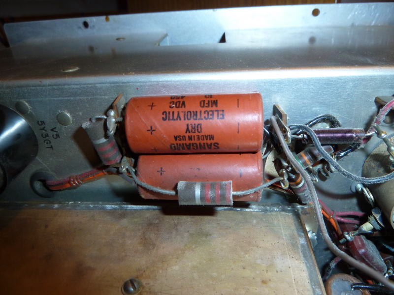 Momentan sind die Elkos am Formieren, grundsätzlich sollte das Gerät noch funktionieren. Erfreulicherweise hat es nur 2 Papierkondensatoren, die restlichen sind unverdächtige Keramik- und Glimmerkondensatoren (neben den paar Elkos). Somit dürfte nur eine Reinigung nötig sein, wie die Bilder zeigen: