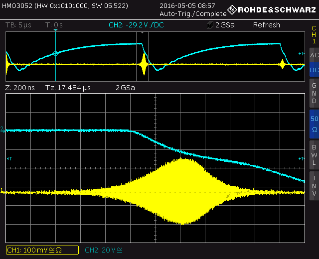 Hier noch eine Messung. Blau ist die Pendel-Steuerspannung für das Gitter der Audionröhre, die Amplitude beträgt ca. 80Vss und die Frequenz etwa 36kHz. Gelb ist das HF-Signal, wie man es am Eingang messen kann (und wie es auch abgestrahlt wird, wenn man eine Antenne anschliesst). Im unteren Teil ist der Ein- und Ausschwingvorgang noch gedehnt dargestellt, die Zeitbasis ist 200ns/Div. Die Verzögerung gegenüber dem blauen Steuersignal kommt vermutlich daher, dass die Spannung über einen Vorwiderstand an das Gitter geführt wird und dort noch ein Kondensator vorhanden ist, was einen Tiefpass bildet.