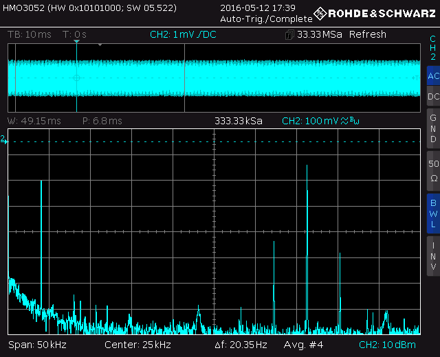 Hier noch das Spektrum (5kHz/Div und 10dB/Div) bei 4kHz NF: Man sieht schön die Pendelfrequenz von ca. 36kHz mit den beiden Seitenbändern der NF. Im Nutzband ist die erste Oberwelle über 40dB unter der Grundwelle, was einen Klirrfaktor unter 1% bedeutet.