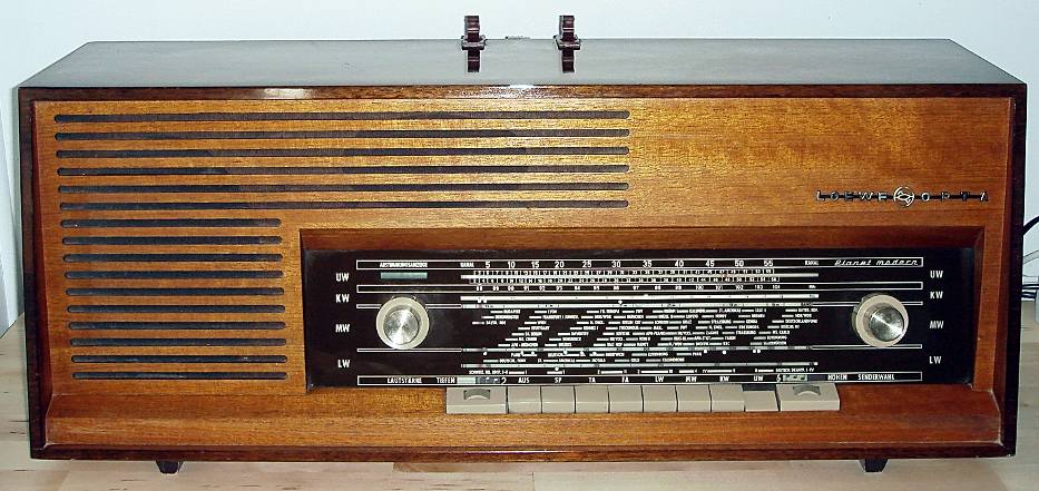 Herst. : Loewe-Opta Mod. : Planet modern Jahr : 1962 Bes. : LW, MW, KW und UKW Bem. : Wechselstrom, Holzgehäuse, 6 Tasten, 2 Lautsprecher, abschaltbare Ferritantenne, Netzbetrieb