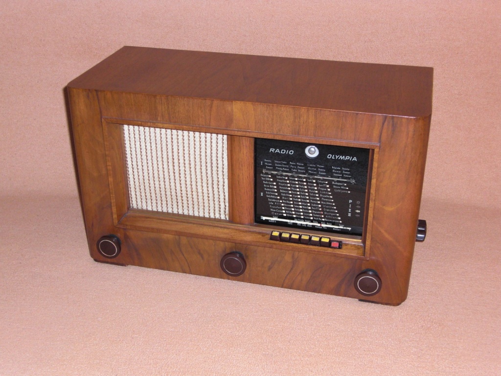 Hallo zusammen, das letzte Radio für heute, das ich euch vorstellen möchte, ist ein Sachsenwerk Olympia 405W von 1939. Das Besondere an dem Gerät ist, das es keine Senderskala und keinen Abstimmknopf hat. Es gibt nur Sender-Festtasten. Zwei für LW, und 6 für MW. Die Programmierung dieser Sendertasten erfolgte, hinter einer Abdeckung an der Unterseite, mittels Spindeltrimmer. Das Radio hat 6 Kreise und den Röhrensatz: ECH11, EBF11, ECL11 und AZ11. Es gab außerdem noch einen Klangregler. Dieser Super gehörte zu den preisgünstigsten des Jahrgangs.